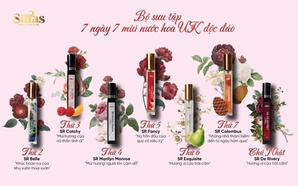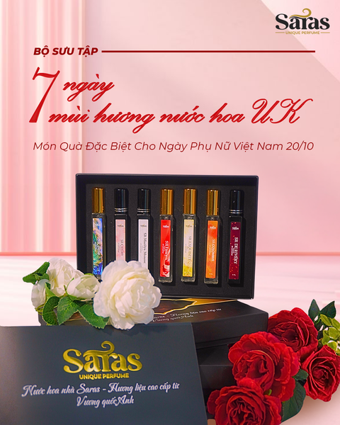 Nhân dịp Ngày Phụ nữ Việt Nam 20/10, bạn đã sẵn sàng trao tặng một món quà đặc biệt, gói trọn vẹn một câu chuyện đầy mê hoặc chưa? Saras Perfume tự hào giới thiệu Combo 7 mùi nước hoa UK “hàng hiệu” cho 7 ngày trong tuần như chiếc chìa khóa kỳ diệu giúp mỗi cô gái khám phá và viết nên câu chuyện của riêng mình mỗi ngày.